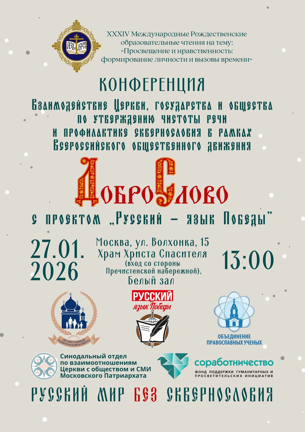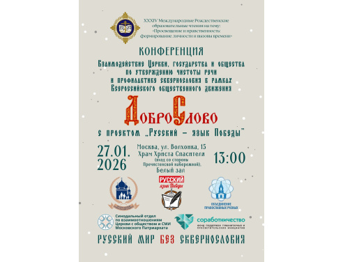 27 января 2026 года в Белом зале Храма Христа Спасителя состоится конференция «Взаимодействие Церкви, государства и общества по утверждению чистоты речи и профилактике сквернословия в рамках Всероссийского общественного движения «Доброслово» с проектом «Русский - язык Победы».